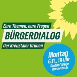 Der Stadtverband von BÜNDIS 90 / DIE GRÜNEN Kreuztal lädt zum dritten Mal in diesem Jahr zu einem Bürgerdialog ein. Nach dem Littfetal und dem Heestal findet der Bürgerdialog diesmal im Ferndorftal in Kredenbach, im Landgasthof Merje statt. Der Bürgerdialog beginnt um 19.00 Uhr.